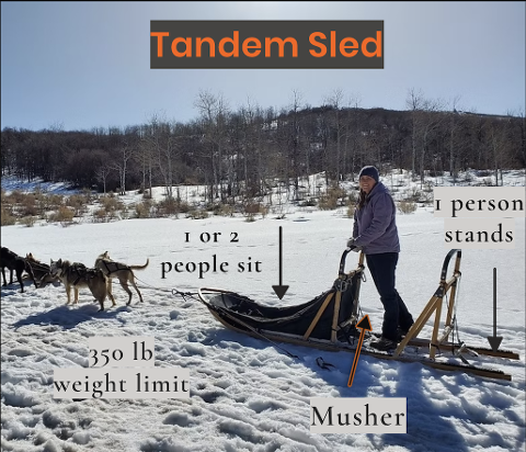 Each sled can hold 350 pounds (this does NOT include the musher) - ONLY THE RIDERS. This can be 1 adult, 1 kid or 2 adults. The tours take place up Spring Canyon located in Coalville, UT. At the half way point we will get out of the sleds to take pictures, pet the dogs, and then return to the beginning of the trail head. You are on the sled approx. 1 hour but plan on being here 1.5 hours in total!!! Please account for this extra time if you are booking transportation. Our tandem sleds allows one person to stand behind the musher. You can switch spots at the half way point with the other rider (who was previously sitting inside the sled)! If both riders want to sit that's an option as well - it will just be tight depending on size of both guests.